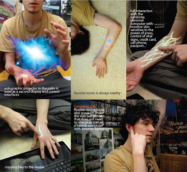 a symbiosis of living tissue and electronic circuits. microscopic soft crystals combines the light-emitting element, the memory and computational modul, injected under the skin of the colony as a tattoo, where they form each other neuronal connections, unite in a cluster organize themselves and create the skin surface pressure-sensitive display.