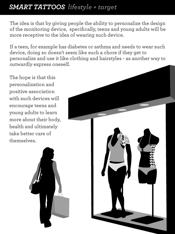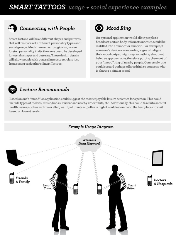 Smart Tattoos are custom designed self-adhesive body monitoring devices. They will be the next generation of Smart Band-Aids. Smart Tattoos will build on this technology and expand beyond a purely medical device into a lifestyle and social experience. Like real tattoos, they will be personalized and unique to each person.Besides having the body monitoring services that Smart Band-Aids offer, Smart Tattoos will explore the social experiences and interactions that come from monitoring and understanding one's body better.