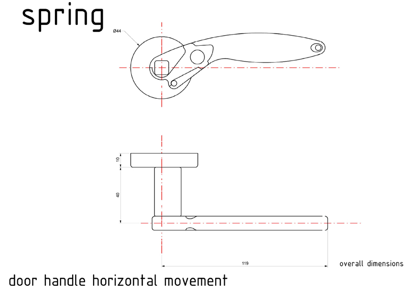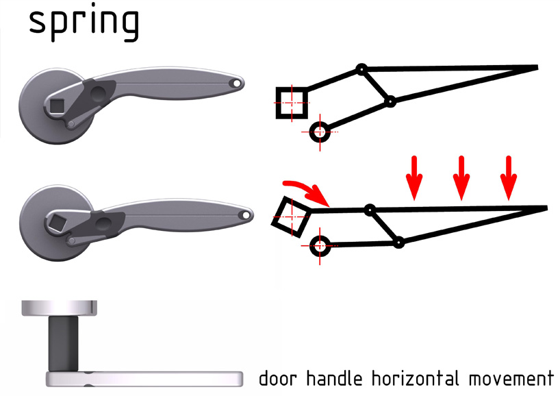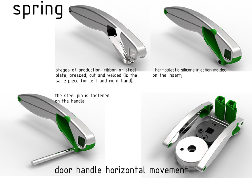 Spring is the handle obtained by pressing, shearing and TIG welding of a single sheet of steel which results in a piece that works for either side of the door.