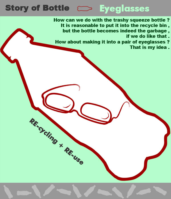 How can we do with the trashy squeeze bottle? It is reasonable to put it into recycle bin, but the bottle becomes indeed the garbage, if we do like that. How about making it into a pair of eyeglasses? That is my idea .First draw a picture of a pair of eyeglasses on the paper, and put the paper to adhere to the empty bottle. Then cut along the line of drawing with shears. A pair of eyeglasses is made. That utilizes the color and transparence of the plastic. The eyeglasses can be designed to any shape and form as we like. Furthermore the eyeglasses also can pin into a ring, which, modern and individual, can be wear around the wrist.