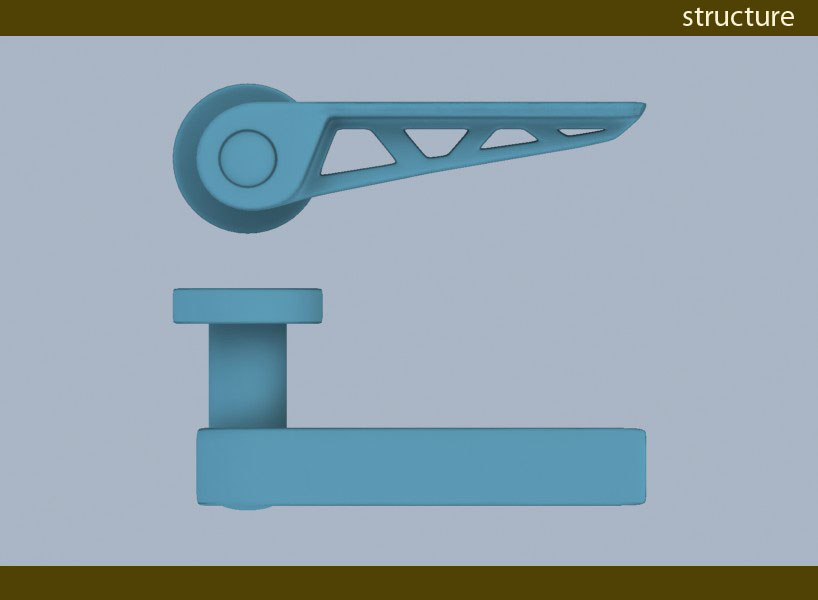 the moment force (torque)that is acting upon the door handle was used as a guide line for a "mechanical" design of this handle.It's structure gives it strenght as well as style. Material used is brass with sattin chrome finish or cast alluminium.and for accentuation is used a touch of chrome.