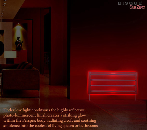 The rear surface of the radiator is available in a selection of highly reflective photo-luminescent* colours which under low light conditions creates a striking glow within the Perspex body. This innovative design radiates a soft and soothing ambience into the coolest of living spaces or bathrooms.....................