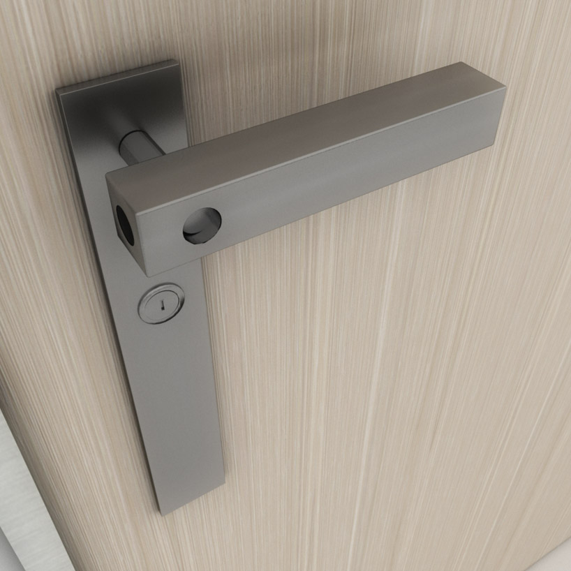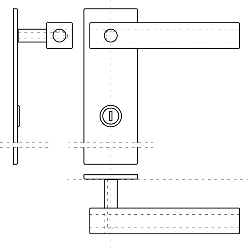 this handle is derived from the “bulk” handle and is designed along the same lines (a rectangular prism with chamfered or beveled edges, with one longitudinal and one transversal intersecting circular holes ). the main idea is to suggest resilience and ruggedness by means of proportion and used materials. this type of handle is built with an oversized shield that incorporates the key drum.
