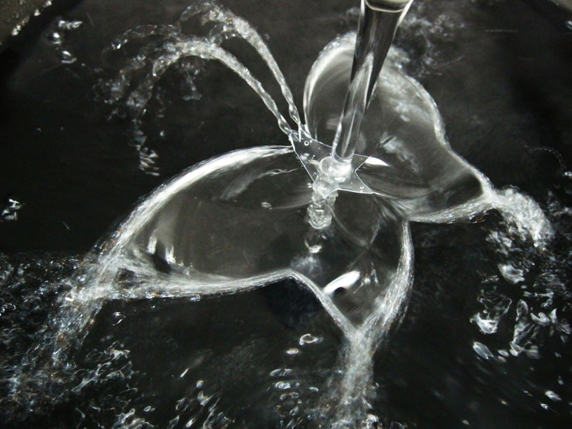 The idea for this project came from a water bell, a phenomenon of hydrodynamics. When tap water hits a spoon, it creates a thin and transparent water membrane. But a handle of spoon divides water membrane and makes a slit. Based on this idea, we developed various target to make unique forms: butterfly, dragonfly, spider, cherry blossoms and arabesque will world-first debut. With the target with special spikes, a stream of water spouts in all directions from the center. The diameter of each membrane is 15 cm.