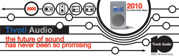 The design depicts a timeline of Tivoli Audio's various designs from 2000 to 2010 (and the "world wide wadio"). The timeline continues on to suggest the great potential for further innovation by Tivoli, looking at the first 10 years as only the beginning of something much bigger.