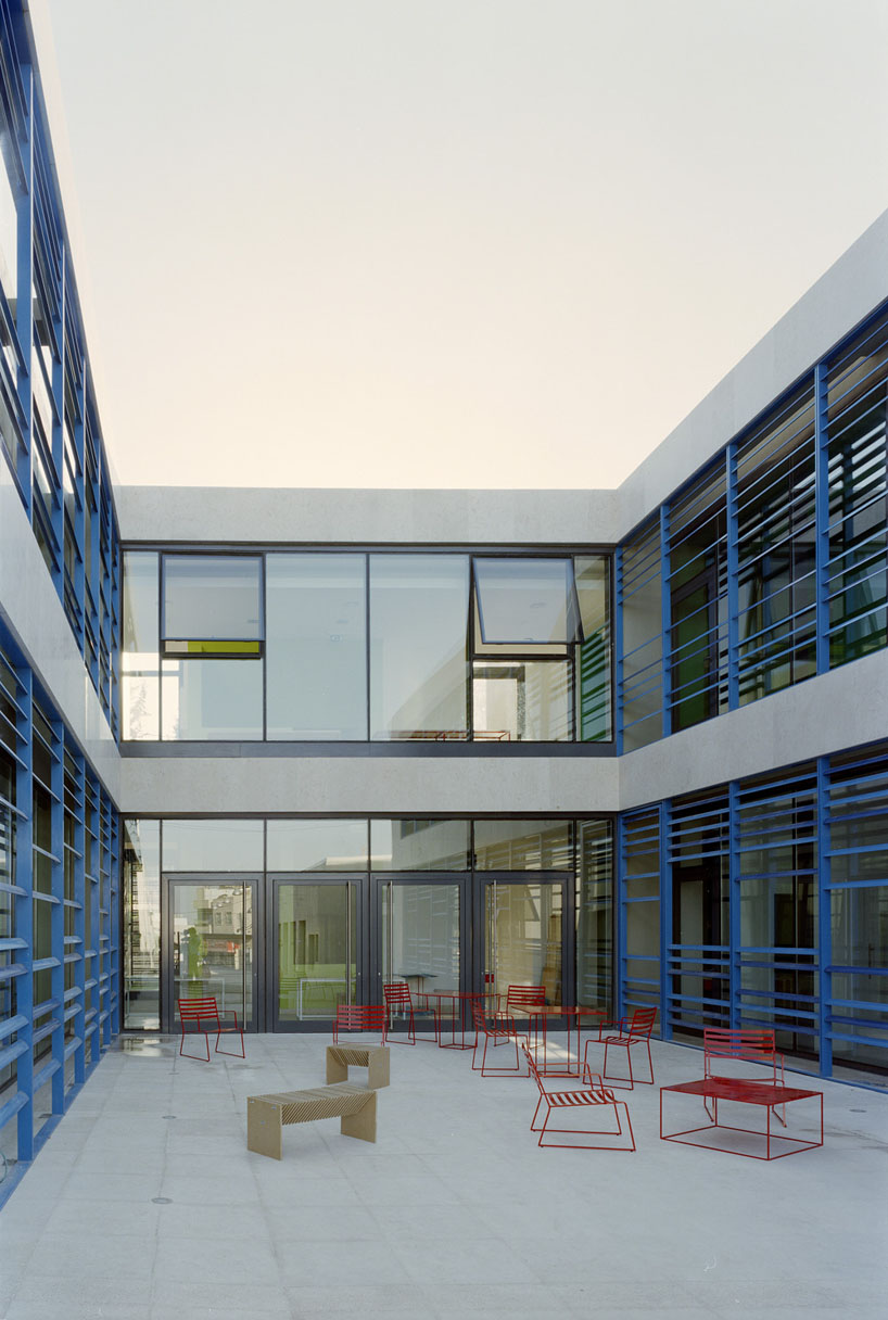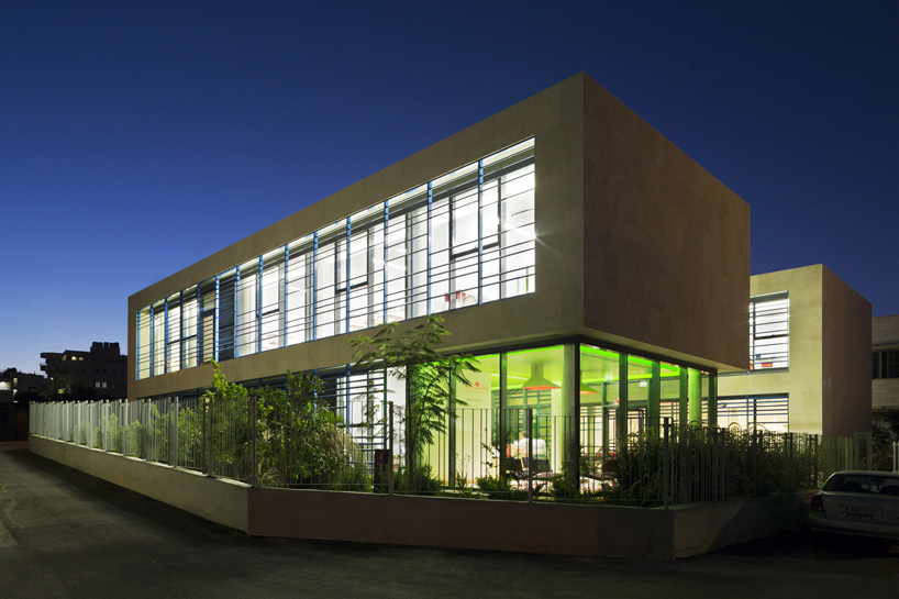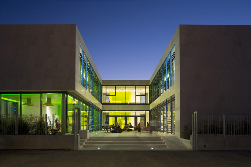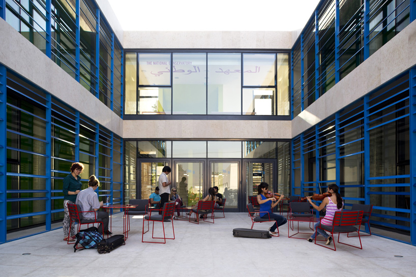 At the image of the traditional “mousharabiyehs” found in the vocabulary of the traditional architecture of the old Palestinian cities, the envelope provides a strong identity to the building, gives a kinetic aspect to the facades, and interacts with sun radiations according to orientations and seasons of the year. The envelope is composed of different shades of blue, which vibrates according to the light of the day.