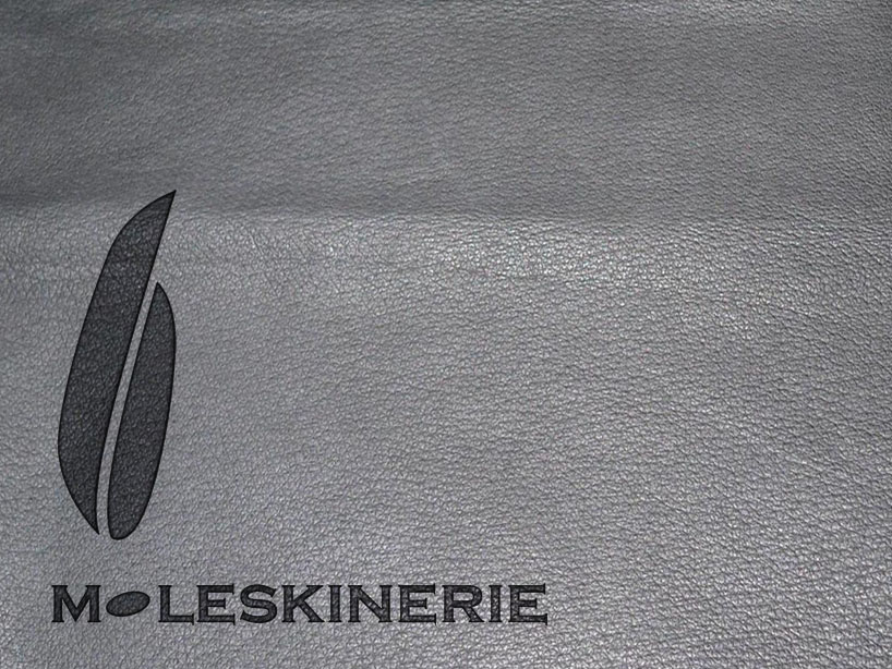 either the complete emblem with characters or the symbol of the feather on its own; either branded on leather or simply printed in black, the attached logo for moleskinerie takes effect in every size and multiple applications.
