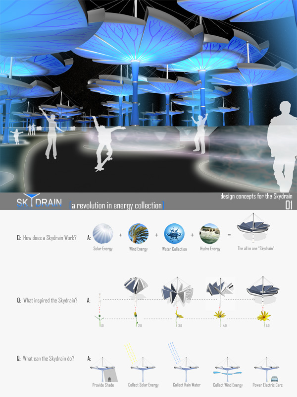 The Skydrain is an energy collection product that is focused on providing clean renewable energy to the existing sprawl condition and other urban sites.