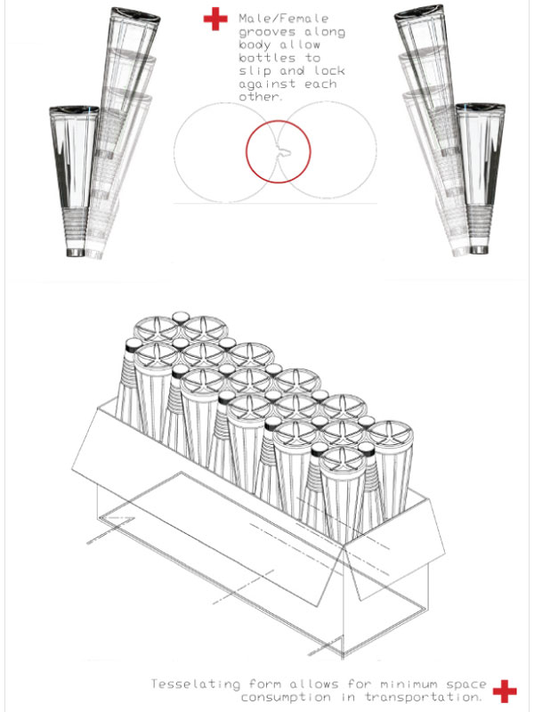 The structure of the bottle which allows for the assembly of tesselative patterns, helps in reducing the amount of space it occupies in storage and transportation.