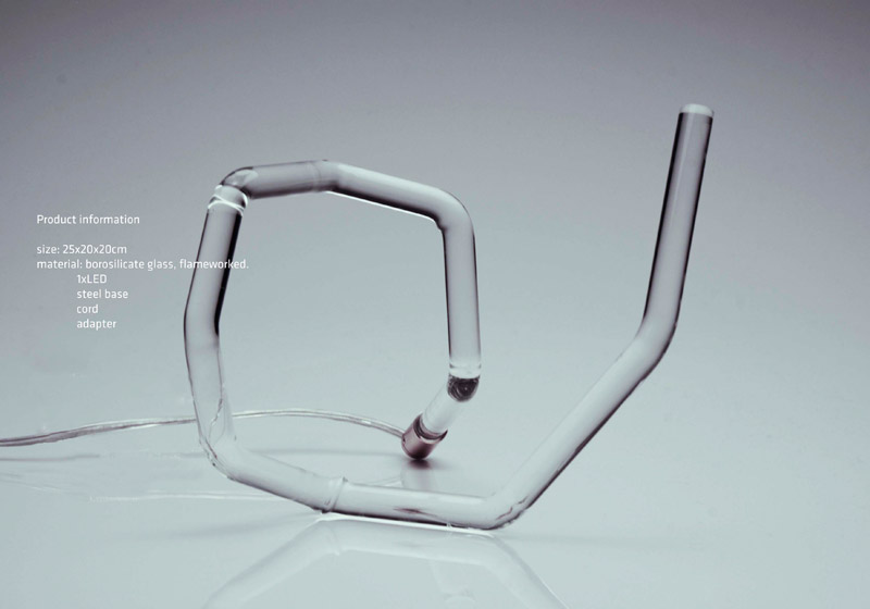 “ Tilted” is a night lamp in which the light appears in a mysterious way. It is transmitted through the solid glass like in an optic-fibre. Light still wants to find it's way out even the shape is angular.