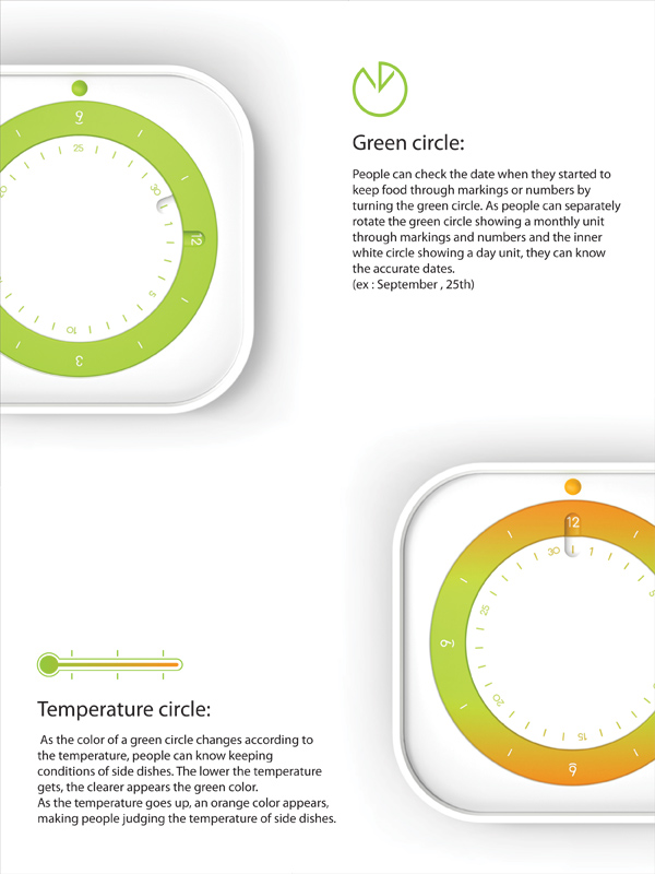 Temperature circle: As the color of a green circle changes according to the temperature, people can know keeping conditions of side dishes. The lower the temperature gets, the clearer appears the green color. As the temperature goes up, an orange color appears, making people judging the temperature of side dishes.