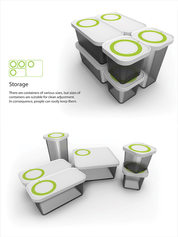 Green circle: People can check the date when they started to keep food through markings or numbers by turning the green circle. As people can separately rotate the green circle showing a monthly unit through markings and numbers and the inner white circle showing a day unit, they can know the accurate dates