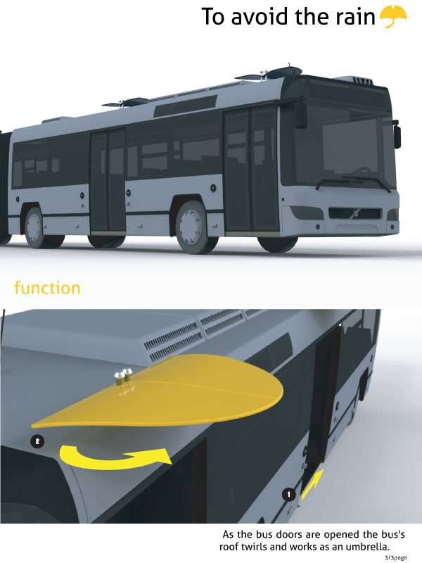 On rainy days the opening and folding of umbrellas can confuse us. Also, the passengers may get wet when the doors are opened. So, to solve this problem we propose a bus shelter, which opens rotating and protects the passengers from getting wet.