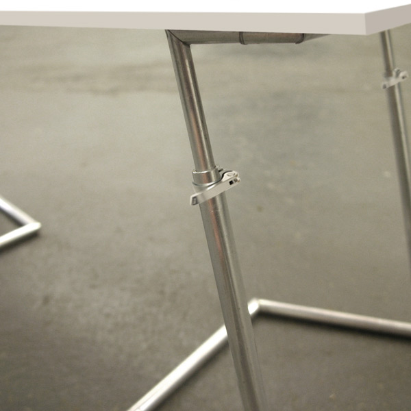 Any type of table top can be placed on the trestles (wooden top, glass top, etc). The table top sits on rubber o’rings (no fixings).