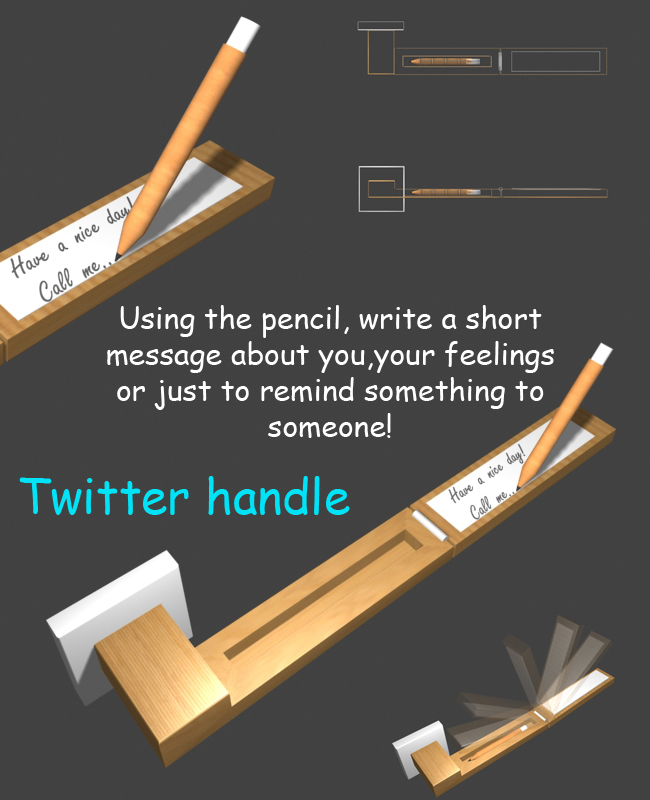 Rotate the half part and write a short message about you, your feelings or just to remind something to someone. Take the message with you or use the rubber and write again. Also you can leave the message on the handle.