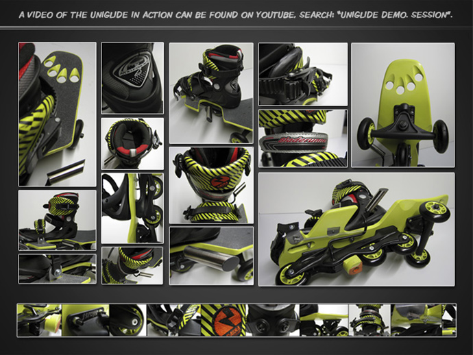It’s a real bother and quite boring getting around a large University by foot! Precious time and energy is wasted moving from point A to B. Bikes, skateboards, rollerblades and foldable scooters are good but lack many important aspects essential to traversing an urban environment. The UniGlide, fabricated from an old roller-skate, skateboard, snowboard bindings and scrap metal/fasteners will get you there efficiently and in style. The combination of the inline wheel’s undercarriage and orientated skateboard trucks allow for super tight turning and maximum stability.