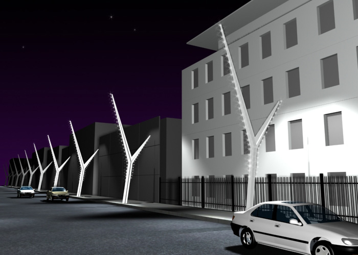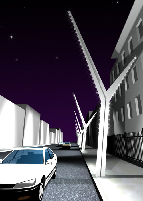 Through simple and ludic elements, I presented an environmental illumination design for public areas. Light milestones delimit urban areas creating an even light of low contrast for cars and pedestrians.
