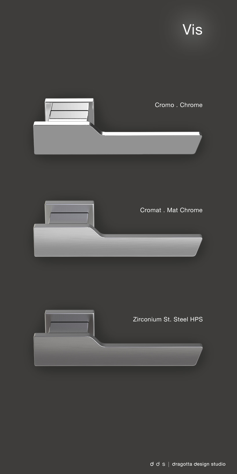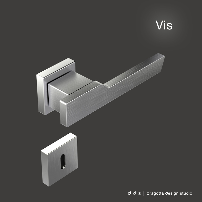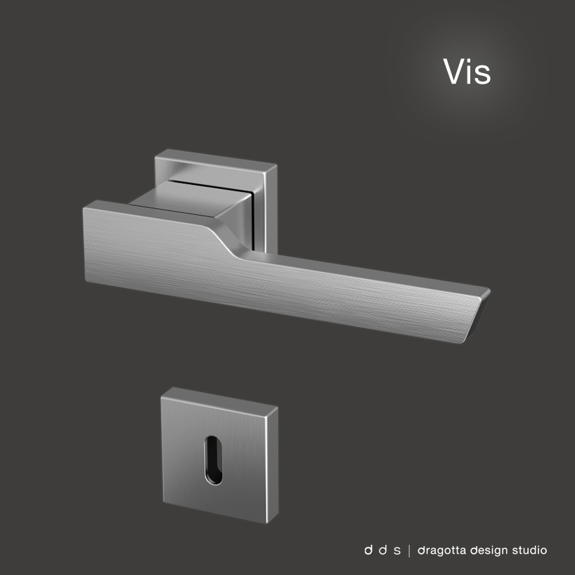 the door handle vis is characterized by a minimal design which combines the rigor of right lines with the functionality of a every day used door handle. the frontal part presents a logical area for the hand, and it's the only one which rotates, while the part between it and the rose, is static.