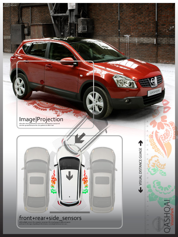 vision park, with the touch of a button projectors eject from the side of the car and project an image on the ground. the onboard computers asses the space available for parking and projects a distance calculation through the projected image. the driver then looks at the wing mirrors and sees the distance that is available and parks with comfort knowing that they have a specific distance available. the image can be changed using the vision park button, the driver can choose either a graphic measurement or an image to show the distance remaining. the vision park is also an expression of style as the graphic can be changed by the driver, expressing who they are, so the driver can now enjoy even the parking experience in the qashqai.