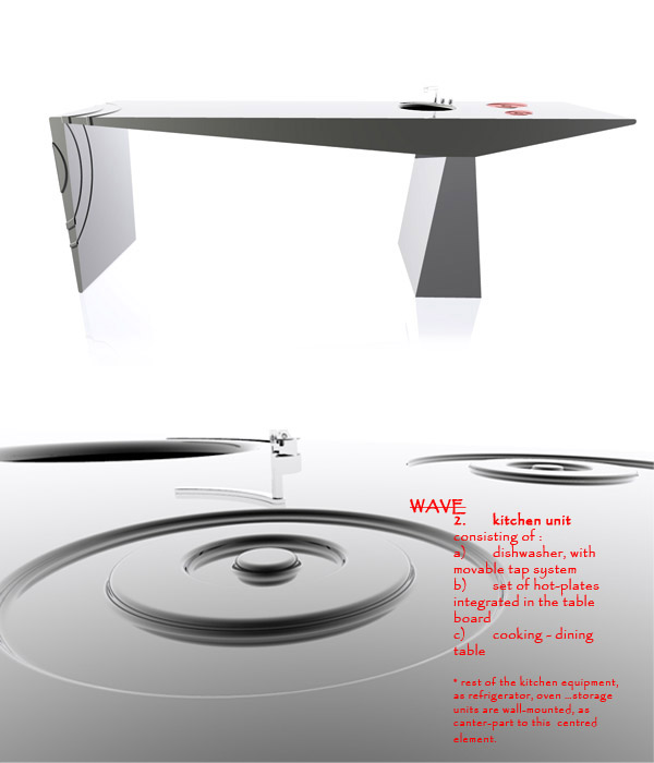 The WAVE is combining elements of fire & water & time & sound to make spaces intervene and be flexible. The functions of … living…dinning … cooking …dancing… talking… existing … all are mixed with no walls in between, making the existence of WAVE more than realistic future…