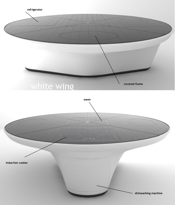 The main caracteristics of this design are simplicity and functionality.The main chape is the result of the pure functions that it has to respond to.This space allows multiple operators in the cooking activity and also allows sitting while preparing food,fact that makes it accesible for a large category of people.There are no corners or sharp surfaces at the exterior,so accidents specialy for the kids are almost imposible.All tools are easy to reach and components integrated in the base shape are beeing pulled out automaticly.The smooth surface on top allows objects to sly very easy on it and olso integrates features like air filtering and self cleaning.Beside cooking and dining,this space is like an invitation to enjoy your time with family and friends in a lot of fun activities.
