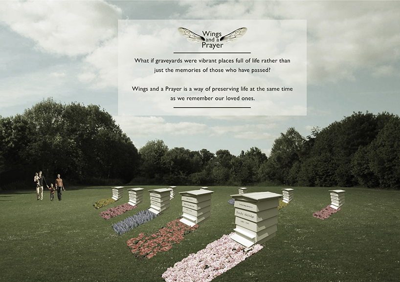 Wings and a Prayer addresses this problem head on, in a way that adds meaning to the traditions of burial and cremation. By replacing static headstones with living ones, in the form of beehives, we change the nature of mourning.