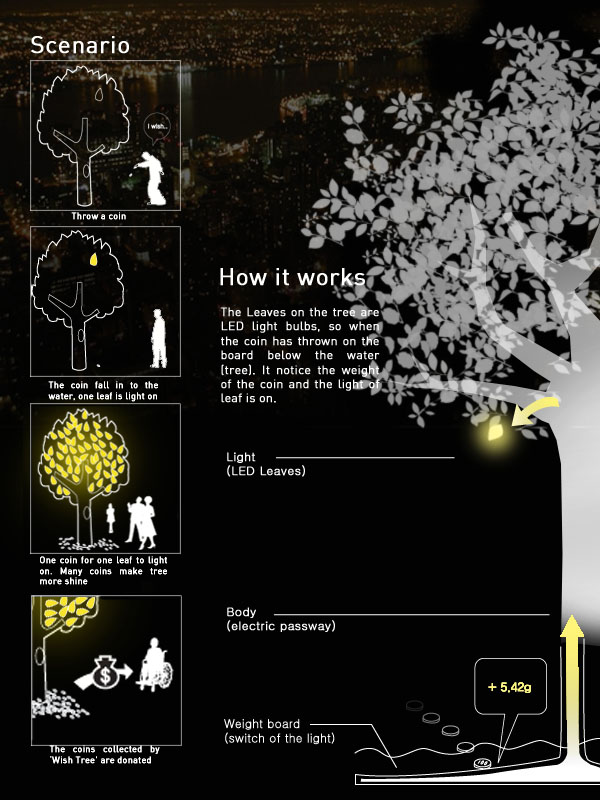 WISH TREE is a street object which has lightings. Its function is not for just lighting but also for donation. If someone throw a coin near the tree, then a leaf will be lightened. This can not only help people who need money but also give wonderful sight to people who are walking near Cheonggye creek.