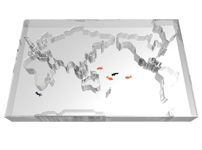 "world trip" is a glass goldfish basin which has shape of the world map. you can enjoy world wide trip and adventure with goldfishes.