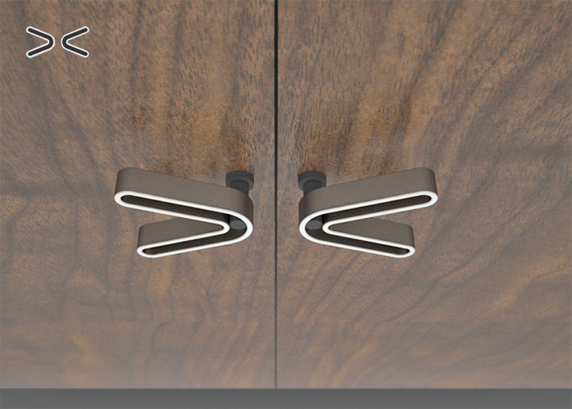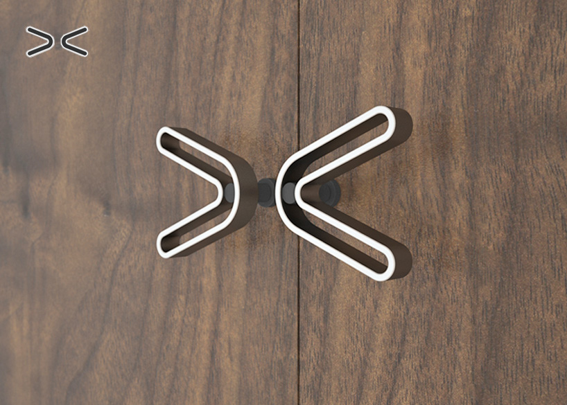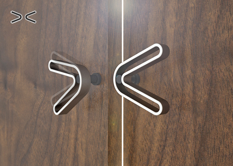 the x handle allows the user to grab from two positions with its unique dual lever design. The form is also an iconic image that marks an entry. the x handle can be cast or formed with stainless steel, or a more innovative approach would be to use titanium powder forming. the handle finish is matte except for the edges, which are polished to emphasize the form. the other working parts come in several values to blend in with the door if possible.