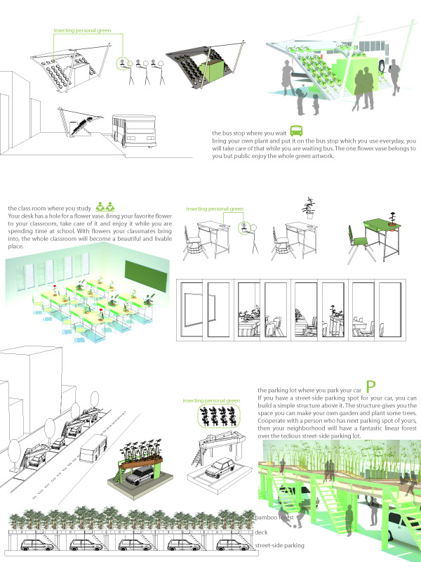 People do not live at home anymore. They live in the places where they work, study, shop, walk, wait, drive....... There is no reason the personal green is stuck at home, the green should go to where actually people live their life. This project is started with the idea that what if we can divide the personal green and insert them into our everyday life.