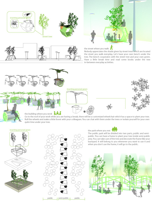 ‘Semi-personal green’ is personal green which is located in public territory. The authorities concerned select the spots which can be leased to the individuals inside of public territory. The interested individual leases the spot during a specific period and manages that spot as a personal green garden or any place related to green activities. The places belong to the each individual leaseholder only while the individual is using the place, otherwise the green place serves for public. This concept prevents tedious urban landscape and makes green environment which people actually enjoy.