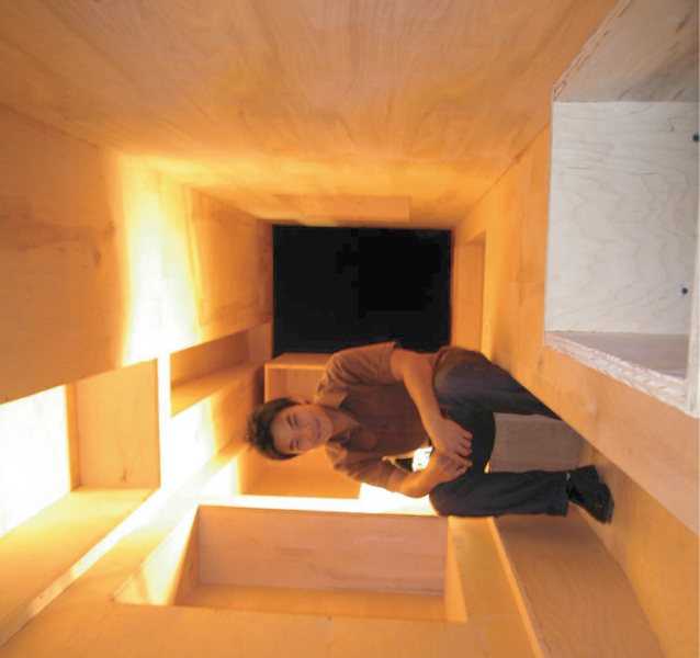 Proposed is a dwelling unit without the differentiation between plan and section. The future home (in space) is a reconfiguration of surfaces containing patterns of earthly domesticity. The inhabitant is liberated to experience the space in a multi-directional manner.