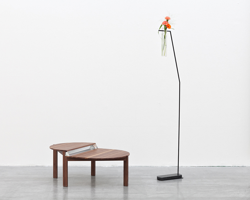 the prism plays an optical illusion with the graphic underneath the table, which appears and disappears according to vantage point