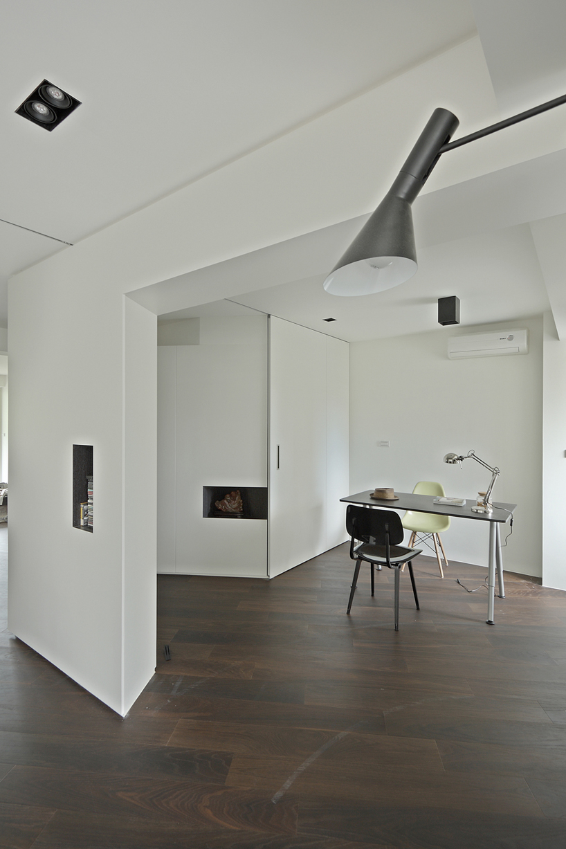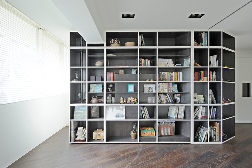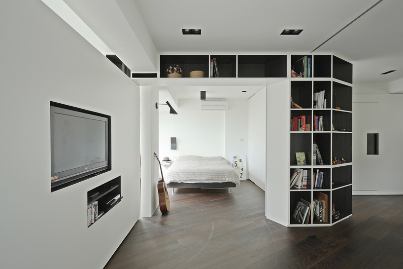 taiwan-based KC design studio has introduced the concept of using two rotatable partitions to divide four spaces into one open-plan area in this renovated taipei apartment by chun-ta tsao. the rotatable TV- partition can be configured in different angles, functioning within the living room and kitchen.