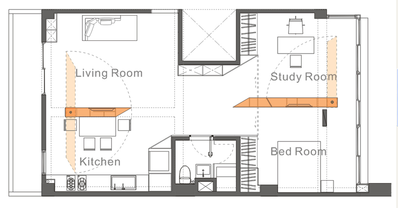 adding square-footage to dining area or living area by simply rotating the object. dark timber is used for the flooring to make three light-color objects standing out, presented as different height between each connected object. the center object is actually a big bookshelf, which divides the study room and bedroom. using sliding doors provides privacy when needed. the part of bookshelf can be moved to study room, transforming both two rooms into the master bedroom.