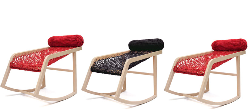 the ‘granny hamac’ by french studio wadebe is a new addition to the furniture collection. the chair is predominantly made from a strong water-resistant elastic netting, characteristic of the range, which can adapt to different body shapes. this is coupled with a cushioned head-rest. the frame is made from natural wood, constructed in a way to allow a rocking motion.