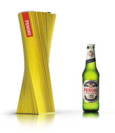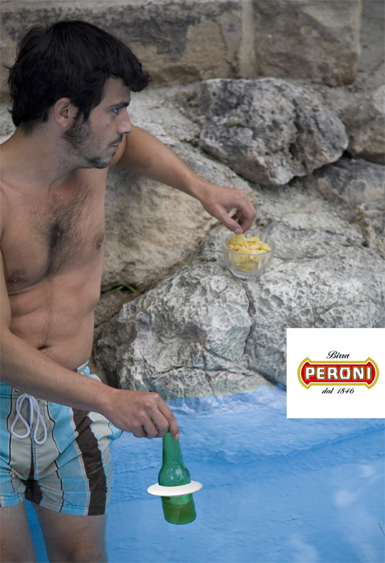 this product protects a bottle of peroni from the sun while enjoying an aperitif in the pool, both inside and outside of the water.
