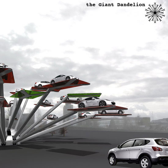 the robotic giant dandelion is a new form of parking construction, which is composed of three levels of parking plates built from kinetic arms that are connected to a central rotating base. the parking plates are lifted and lowered to and from the ground, providing elevated parking spaces. they also change color from red to green indicating when a space is available and vice versa. in order to let drivers see the parking spaces clearly and to add a bit of visual interest to the urban scene, they also glow in the dark.