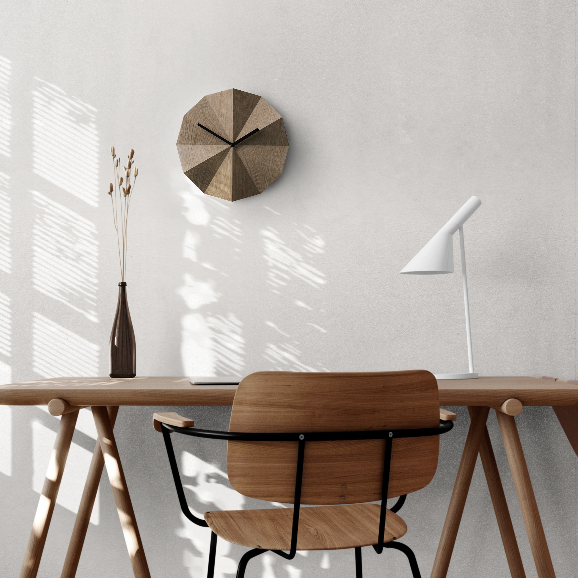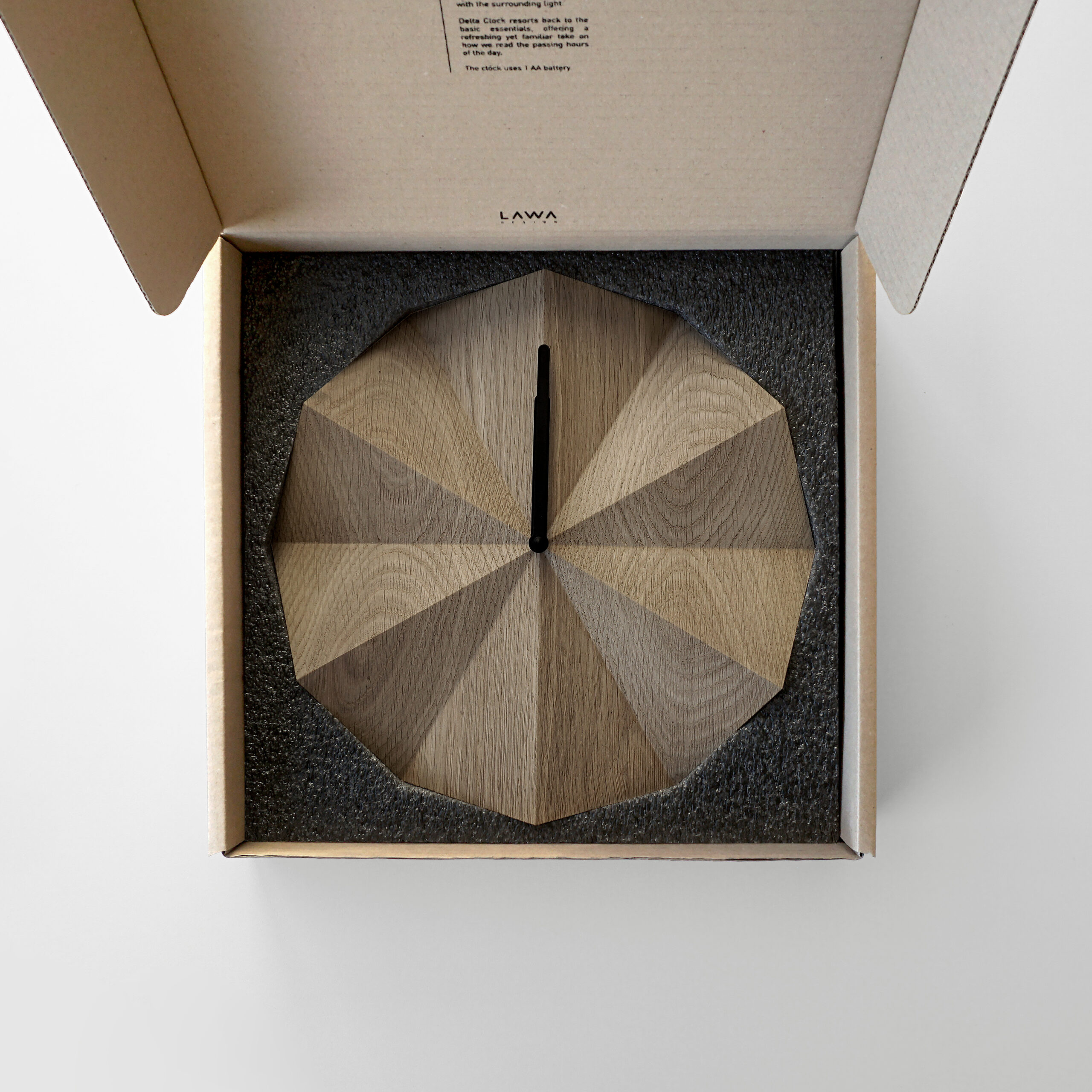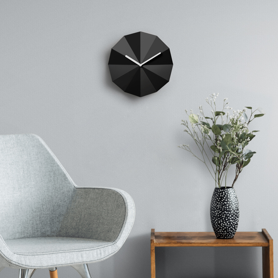 Inspired by the sundial, Delta Clock tells time with the help of light and shadow. The folds in the surface indicate the passing hours of the day and create different shadowplays when exposed to light.