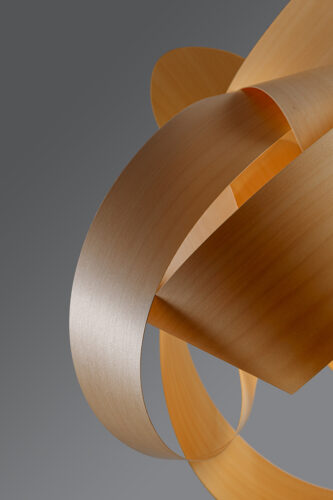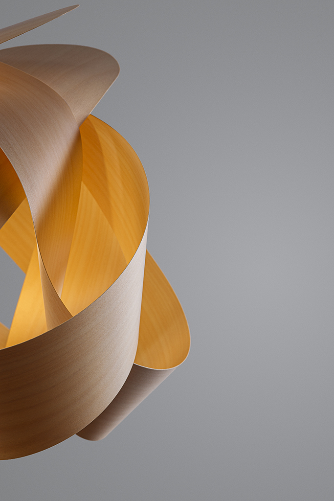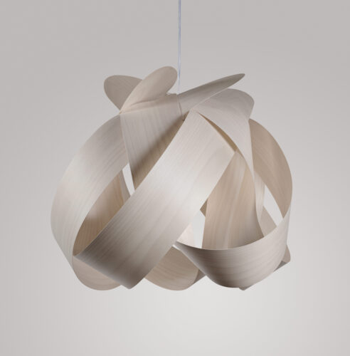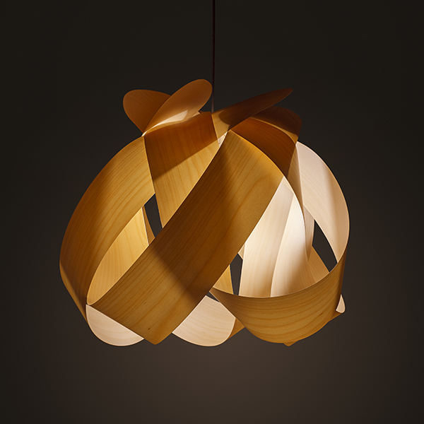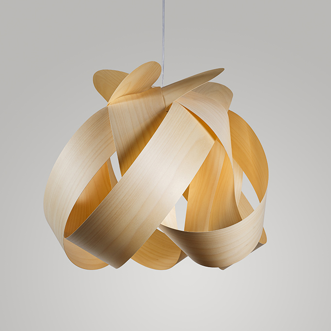 • Assembled light fixture: wire, wood veneer lampshade and stainless steel body frame.