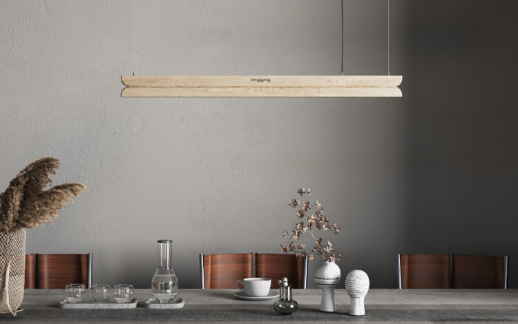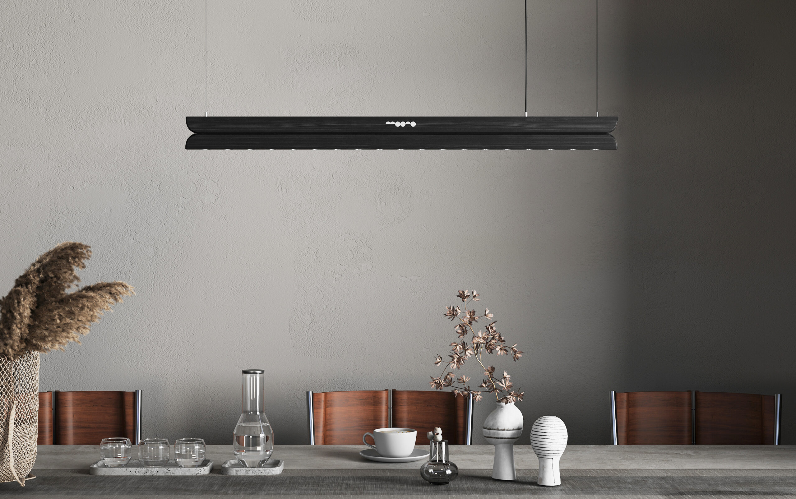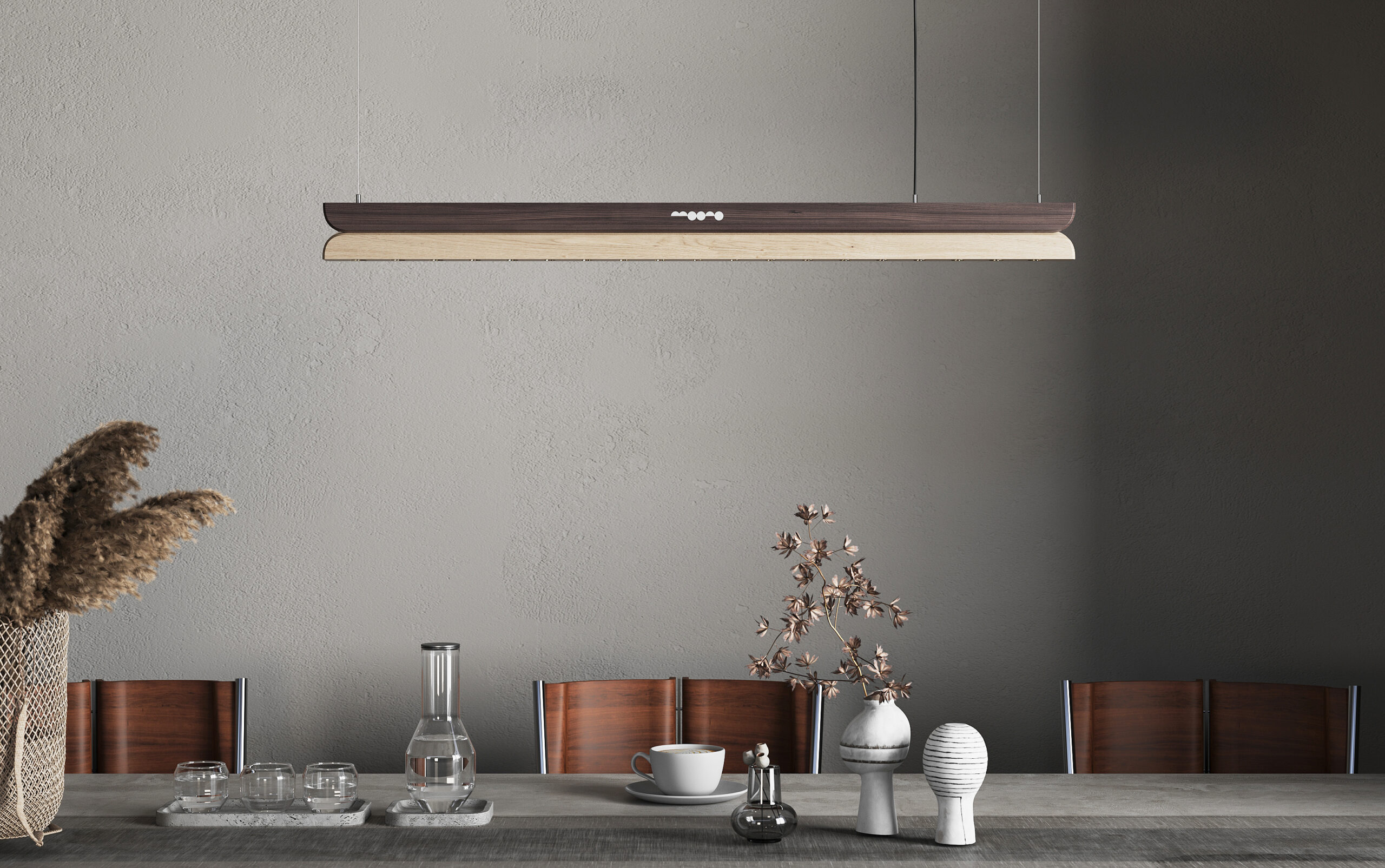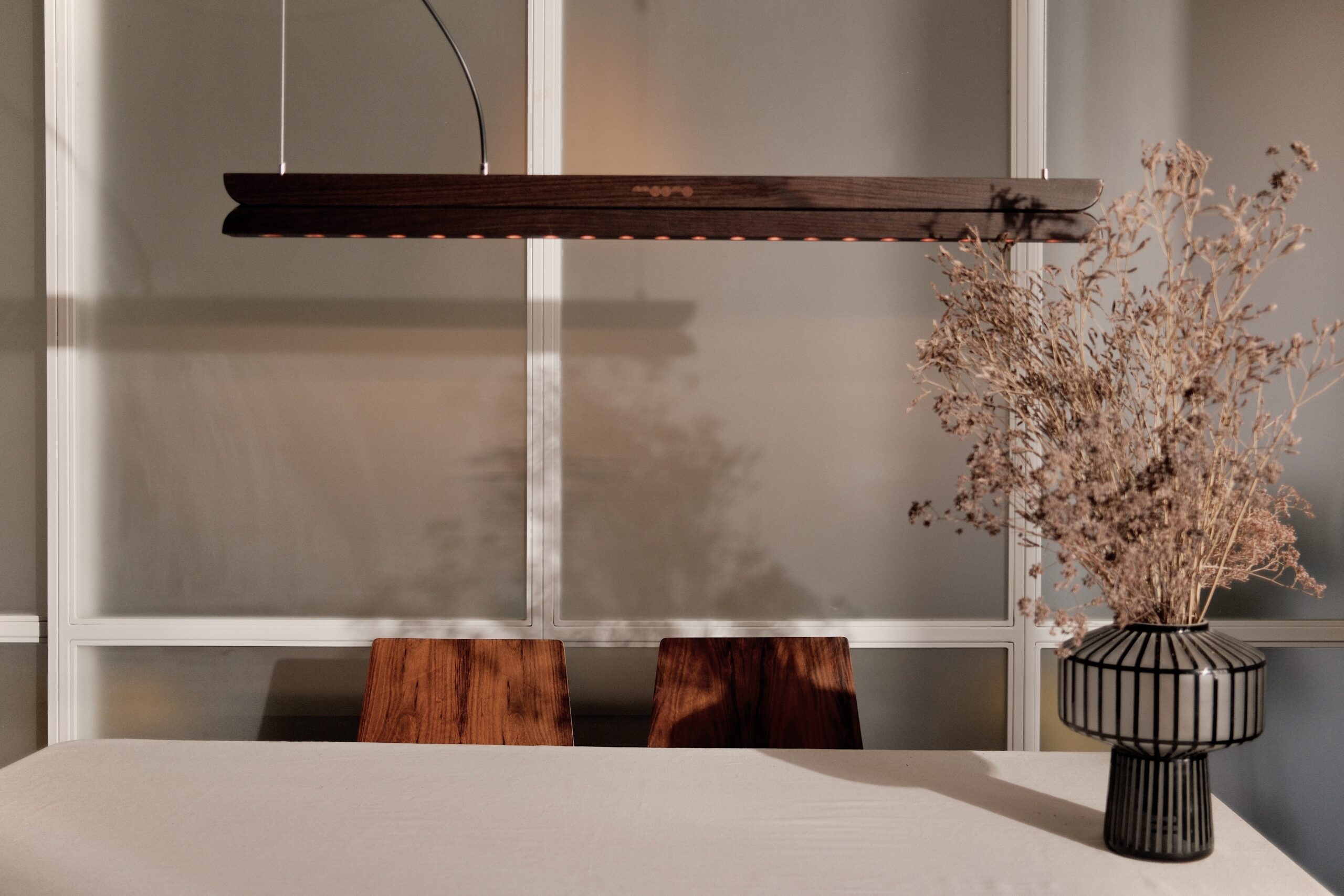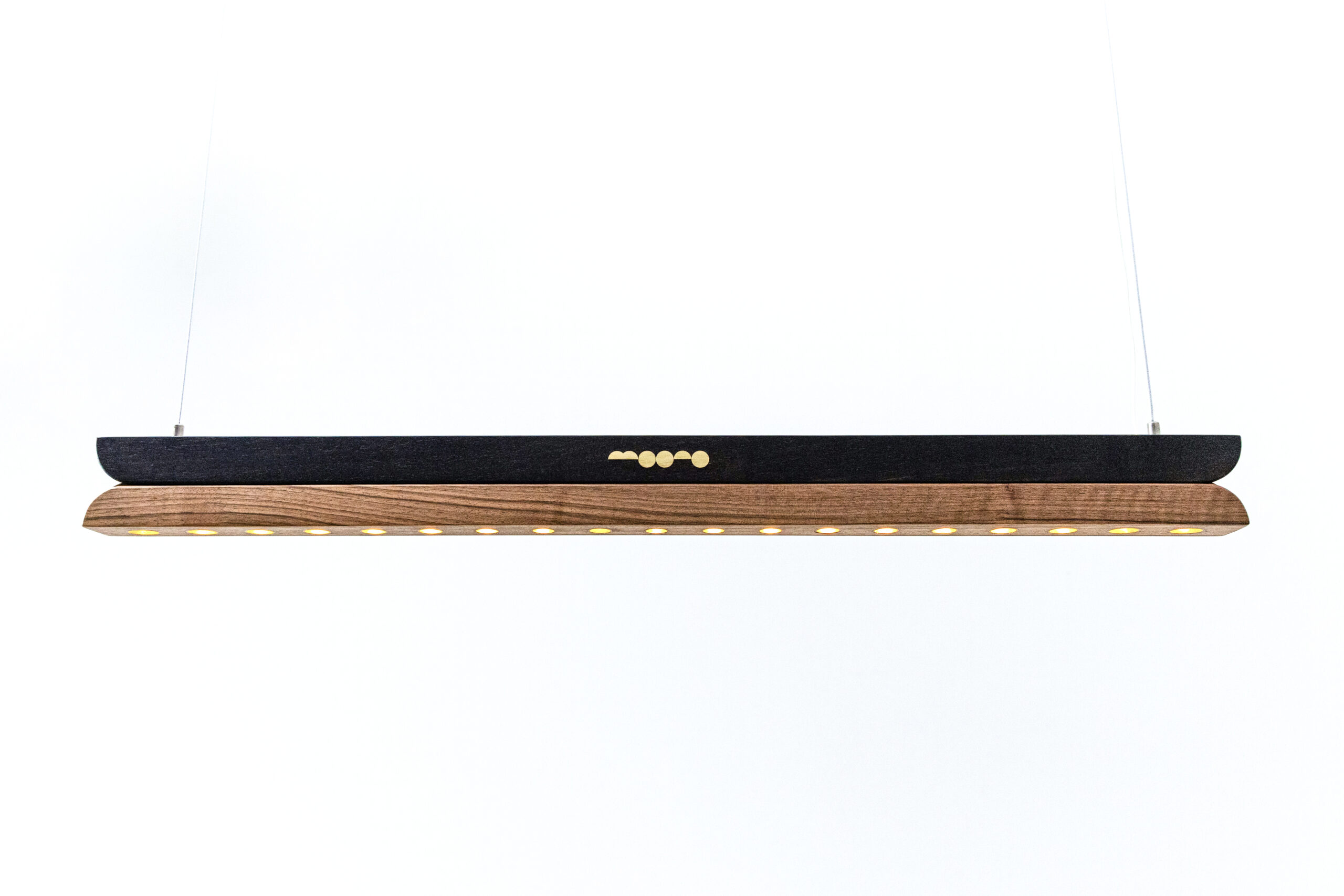 Its unique sliding mechanism allows effortless control of light direction, making Moono both a practical illumination source and a dynamic centerpiece. Available in two sizes (111 cm and 88 cm), it suits a wide range of interiors. The eco-friendly lacquer finish enhances the natural beauty of the wood, while advanced LED technology ensures efficient, customizable lighting.