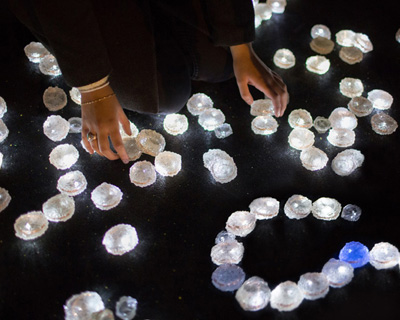 each geometric LED rock is wirelessly charged via a magnetic floor, lighting up when they are touched