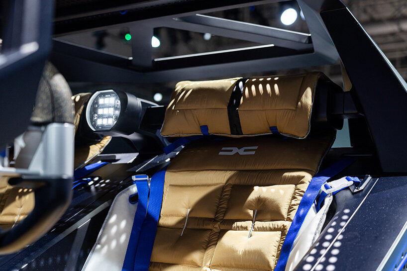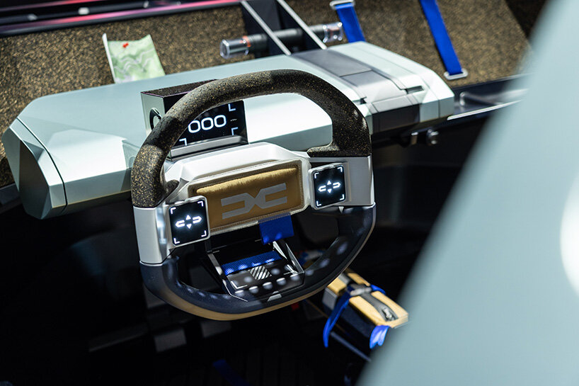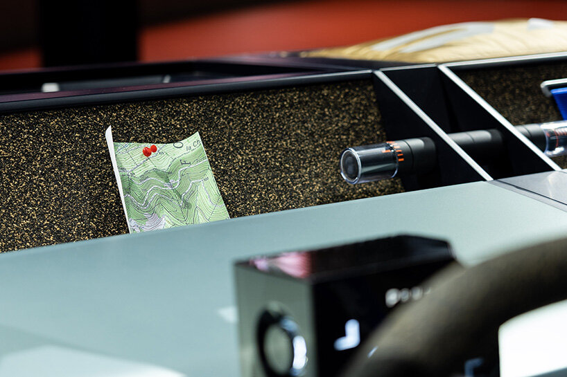 the interiors are wrapped in natural materials, including cork which wraps the dashboard