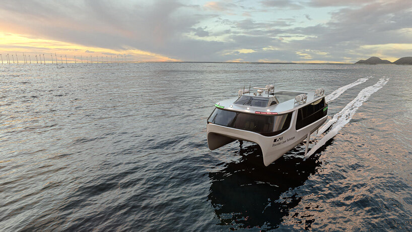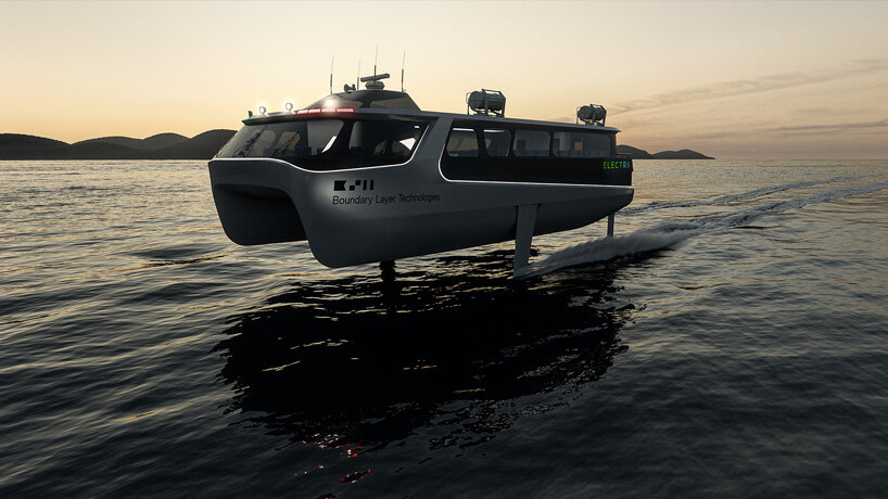 california-based startup boundary layer technologies has launched an electric hydrofoil ferry concept that promises twice the speed and range of existing electric ferries. called ‘electra’, the boat cruises at a speed of 40 knots and has a range of up to 100 nautical miles thanks to a podded propulsion system at the back and two lifting foils that reduce drag in the water.