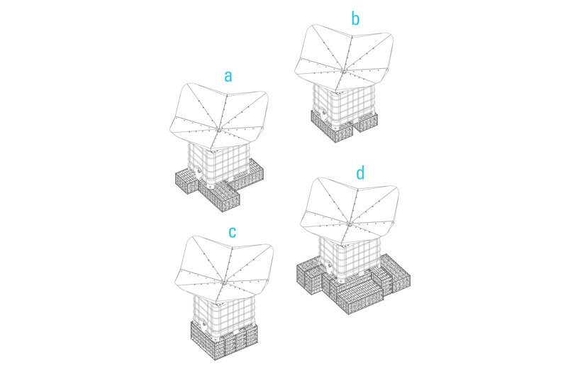 The cover can be installed with ease and secured to the top of a water tank using just four points. The 4.3 square meter rainwater collection surface area can also be customized to different heights and configurations by placing the system on gabions, thanks to its modular design consisting of twelve assembly parts. Additionally, water collection can be maximized by connecting multiple water tanks together at once.