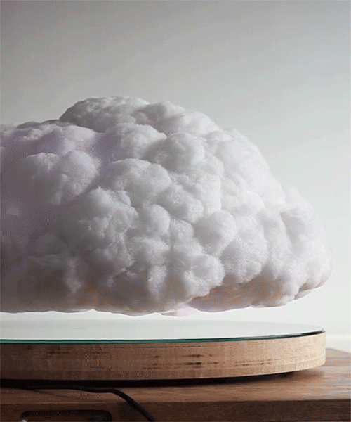 richard clarkson studio and crealev have collaborated to create a levitating storm cloud that doubles as a bluetooth speaker. the cumulus-shaped puff autonomously hovers above a reflective oval base, which is embedded with magnetic components that allow the cloud to float 1-2 inches from its surface. while the base itself must remain plugged in, a rechargeable lithium ion battery powers the cloud and enables a completely wireless and unobstructed levitation while in use.