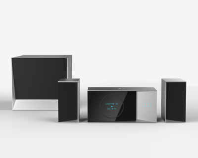 working together with korean manufacturer LG electronics, stockholm-based studio claesson koivisto rune have developed ‘skyline’, a home theatre system influenced by their architectural ethos, and the phenomenon of the modern metropolis. the design elements of the audio units – the center channel, the right and left speakers, and the subwoofer – vary in height and proportion in relation to each other. gently angled planes framed within thin, box-shaped volumes create a visual language, a recurring theme rooted in the swedish studio’s architectural practice. in addition, a false perspective effect seen on the front of each of the speakers references intricate forms and planes from groups of highly-stylized buildings, rising up, to create a silhouette reminiscent of today’s urban city-scapes.