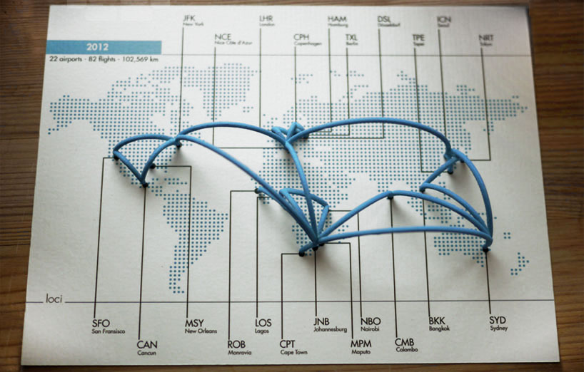 each 3D printed sculpture is placed on a card, bearing the image of a world map, which acts as an infographic of the users journey — highlighting the airports flown to, the total distance traveled, and the number of planes taken. loci is to be integrated into an iphone app, co-created by spitz, called flying, a flight monitoring and tracking program.