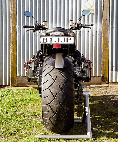 the ‘mad boxer’ was then fitted with wheels sourced off the NZ ebay-equivalent trademe, a kawasaki fuel tank, and a smaller twin-turbo from a subaru ‘legacy’ replacing the huge ‘WRX’ turbo. the result is an engine that runs very smoothly, even though it has no real flywheel. marcel has chosen a modified japanese two-speed automatic transmission, the makes use of a chain drive to help power the rear wheel. there’s no gear lever on the foot pegs as such, just a button on the handlebars to change gears. braking is just like a scooter, with a bar-mounted lever for the buell-sourced brakes. with torque levels that most bikes can but only dream of, the ‘madboxer’ is certain to fly down the block when ridden.