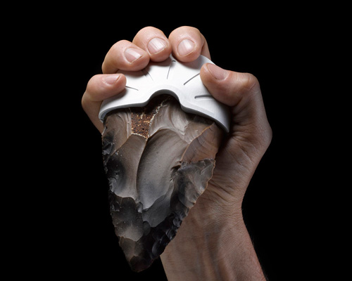 the flint hand-axes were three-dimensionally scanned at the hebrew university, jerusalem’s institute of archaeology. with support from stratasys, the handle files were printed in verogray – a performance polymer. the parts were then prepared and assembled on the original flint hand-axes, effectively joining the two most temporally distant making technologies: flint knapping and 3D printing.